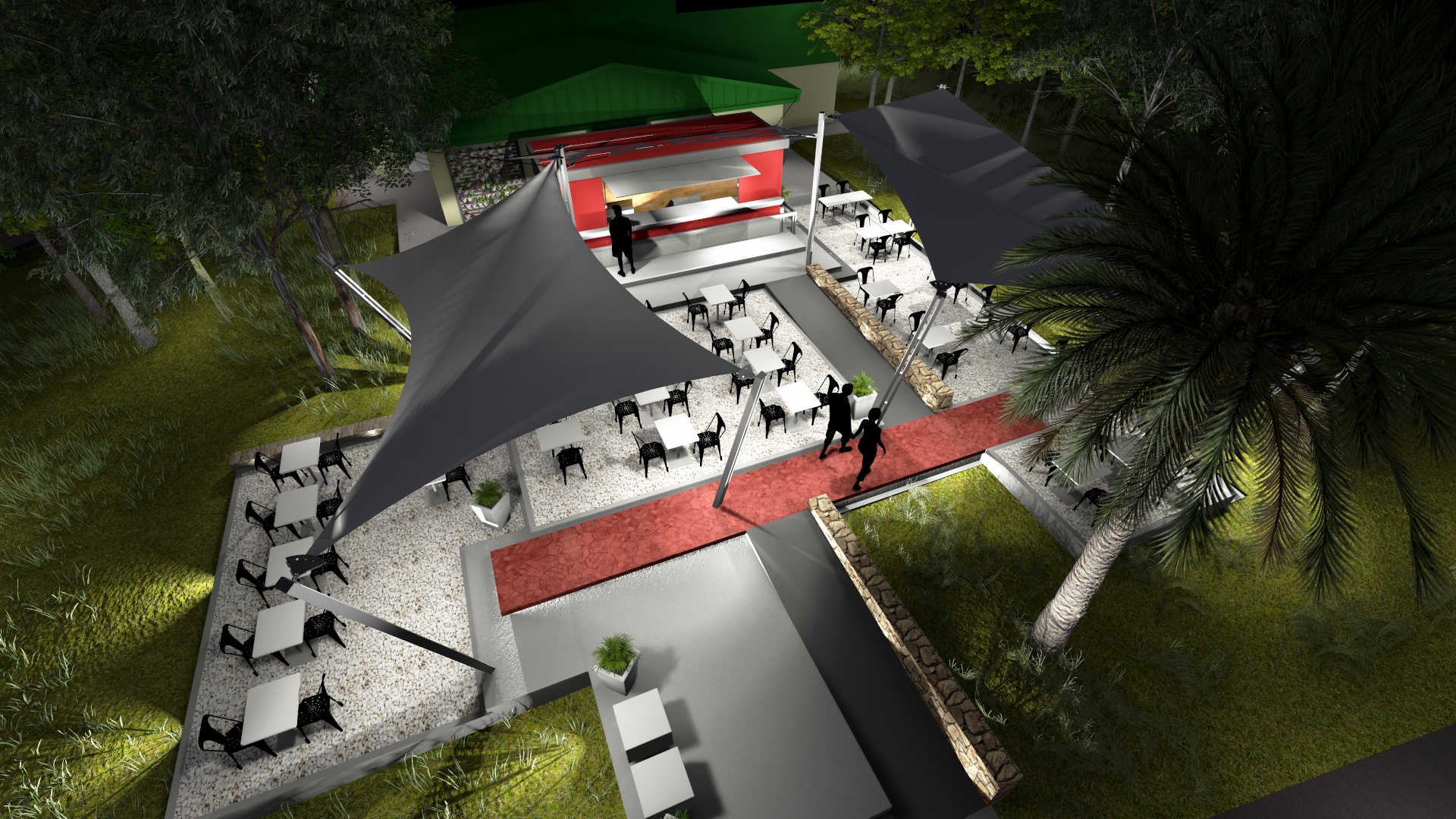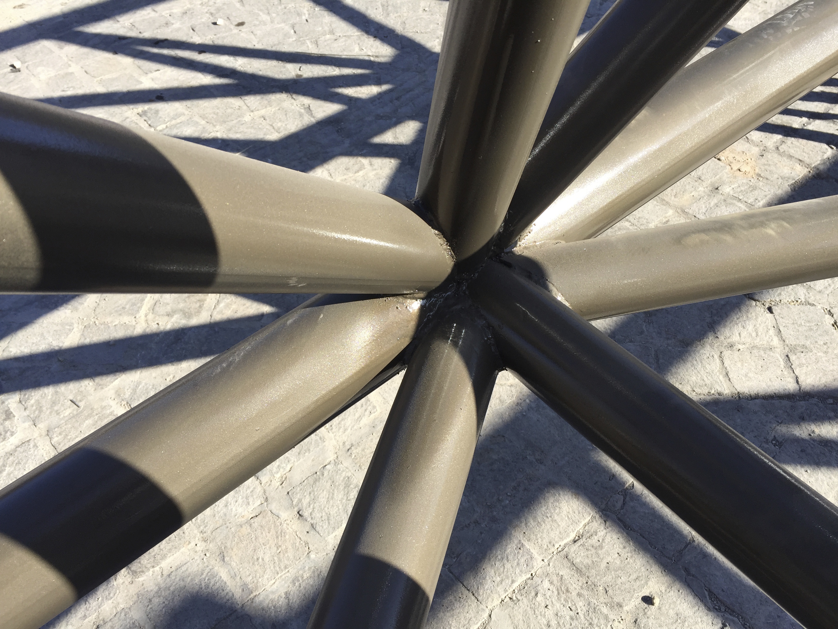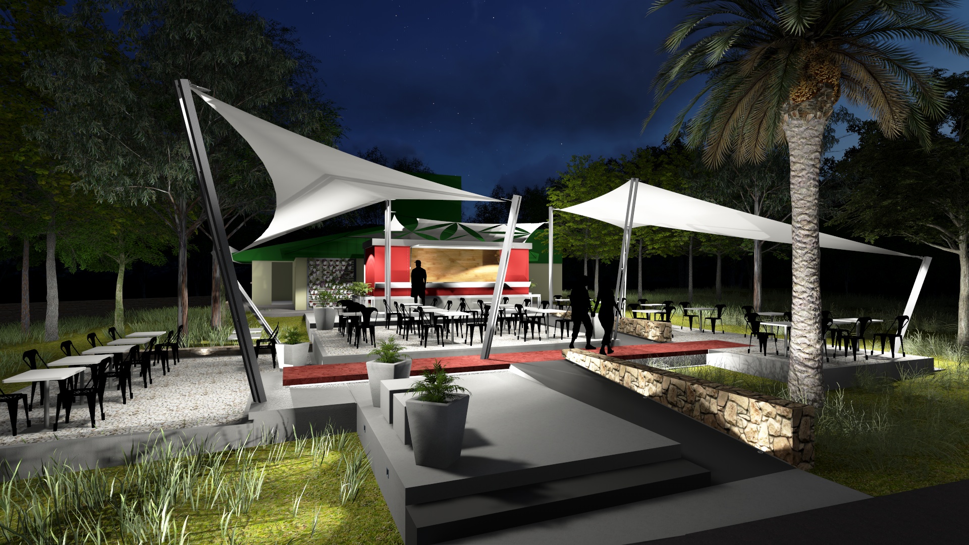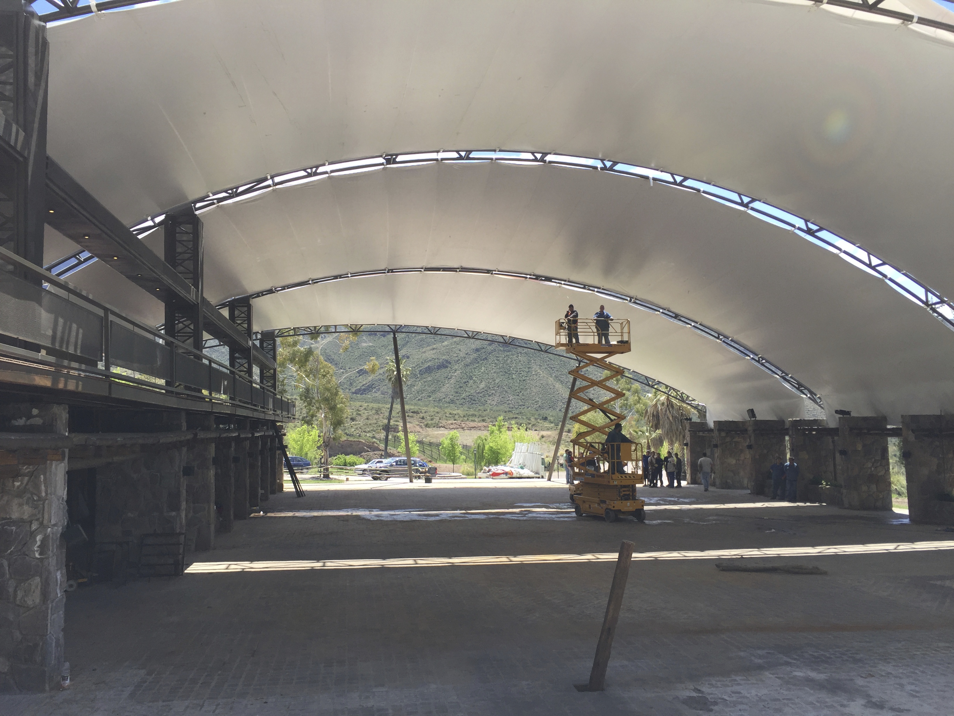 Membrana Textil Tensada tomada a Columnas Metálicas de caño redondo.