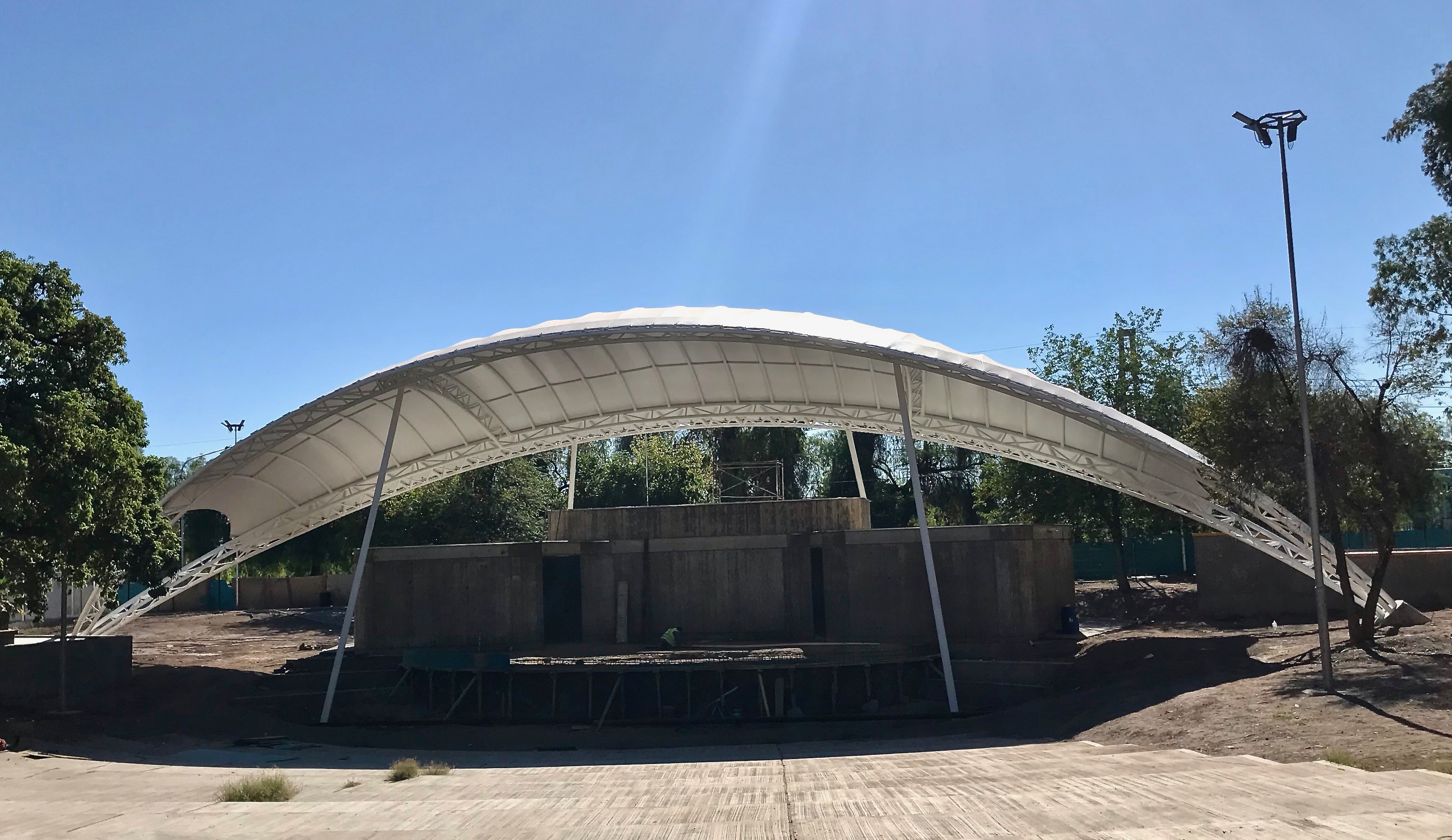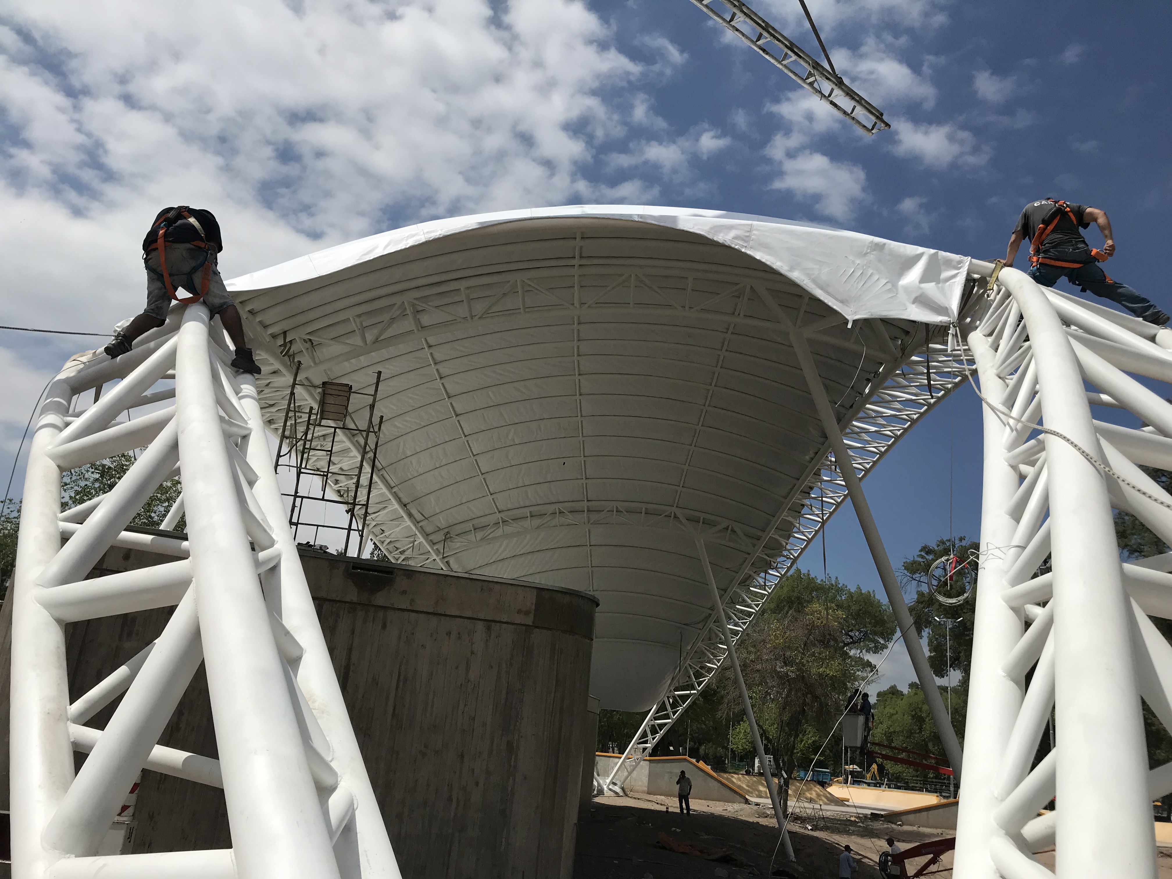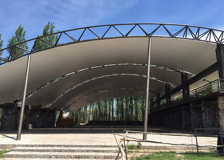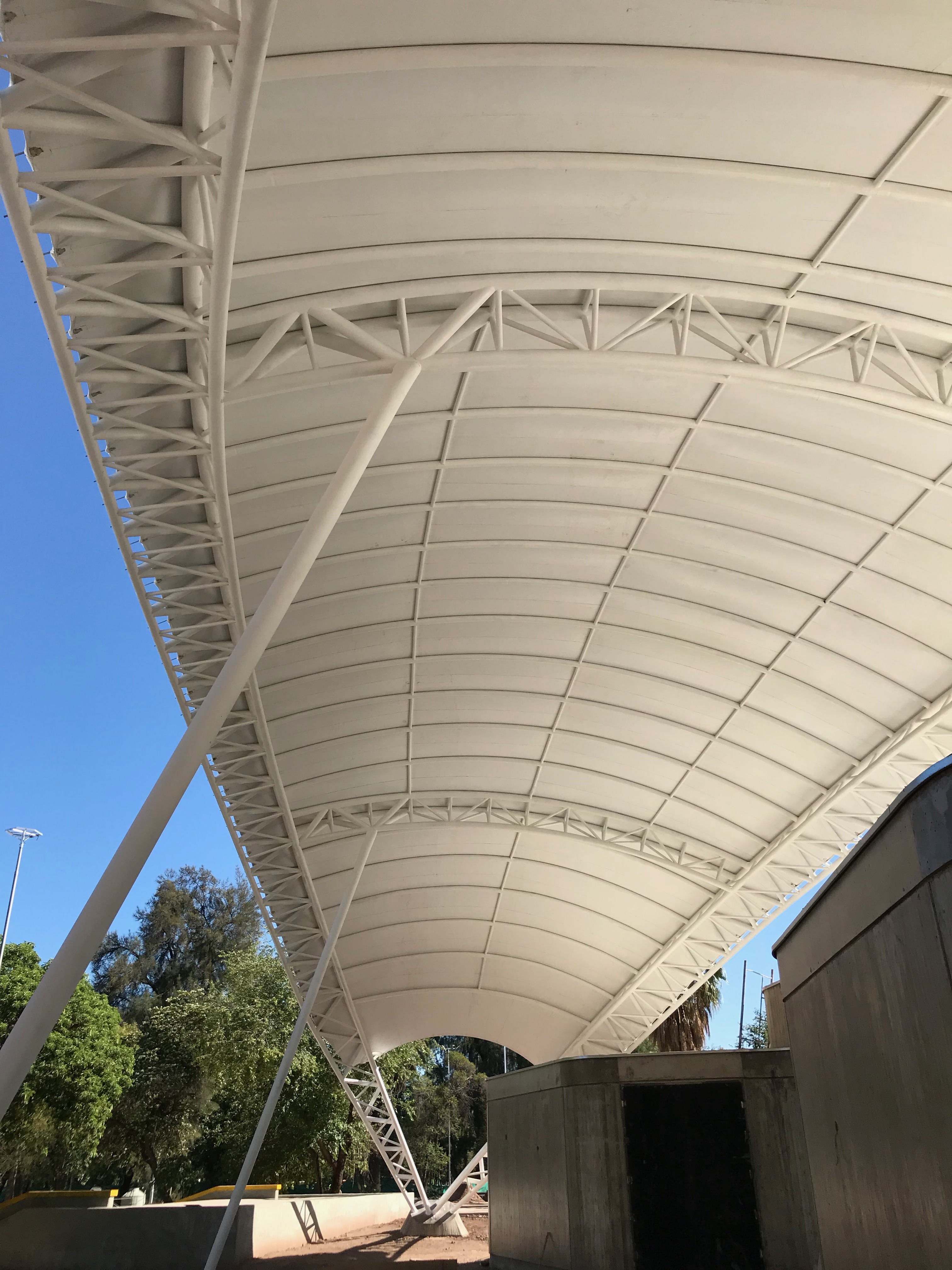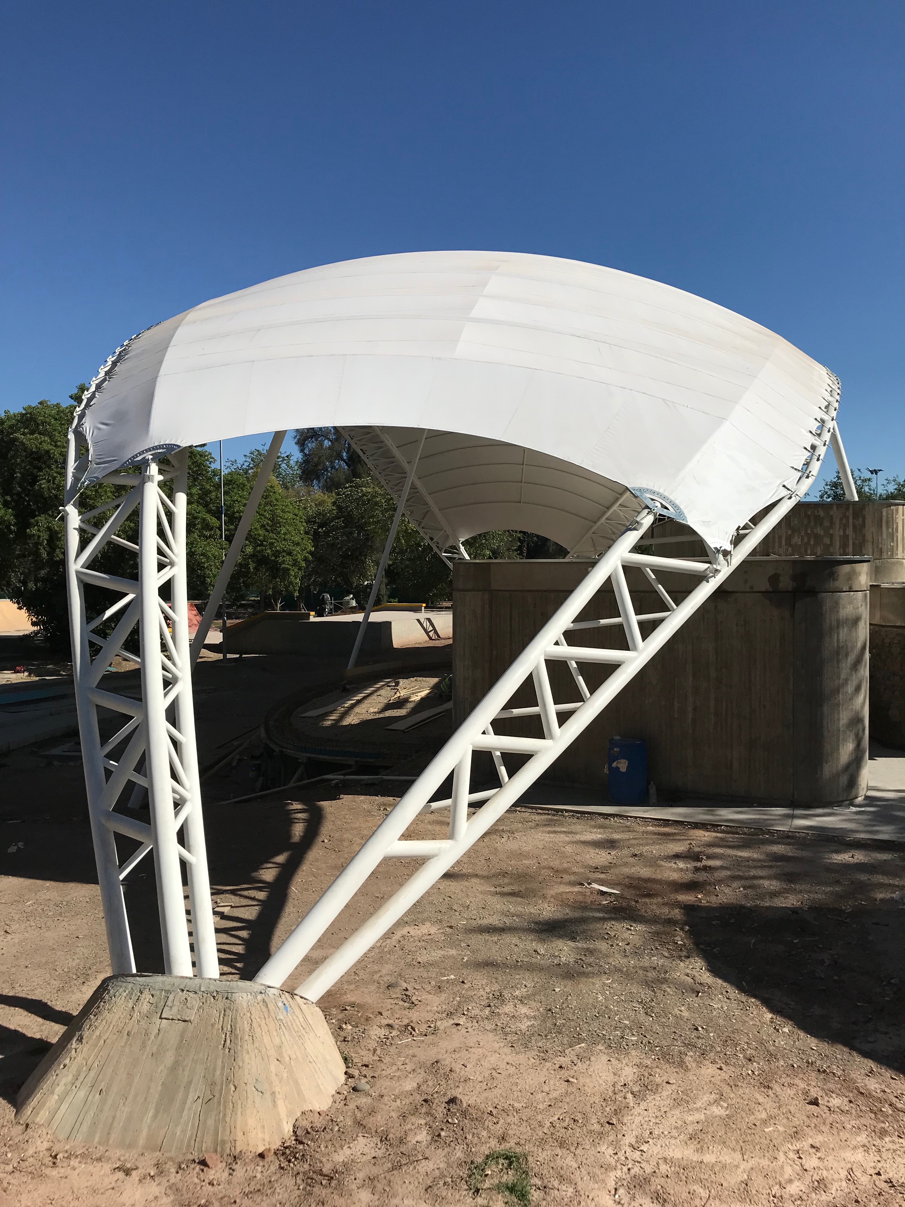 Membrana Textil Tensada tomada a Estructura Metálica compuesta por Pórticos de caño redondo.