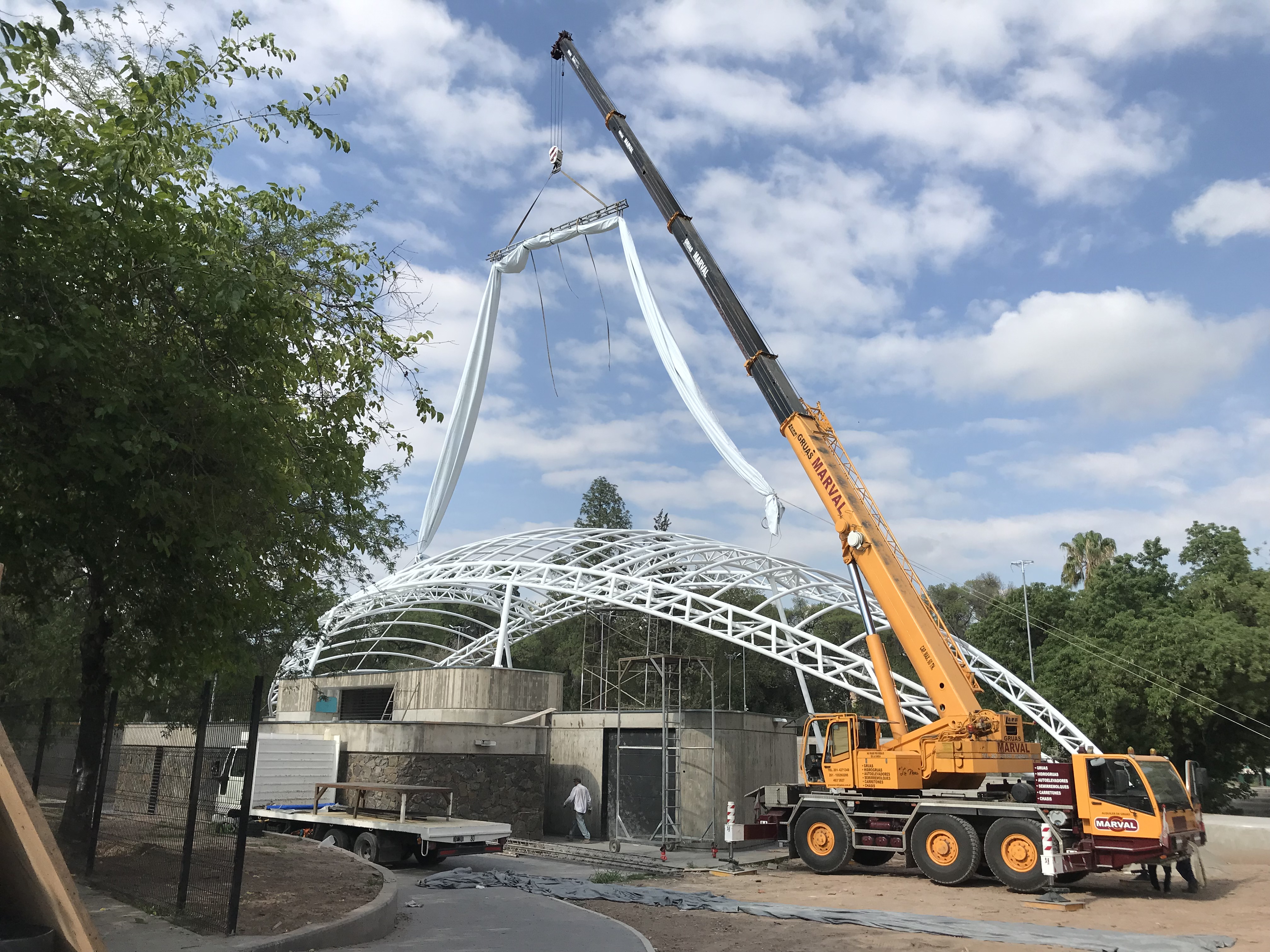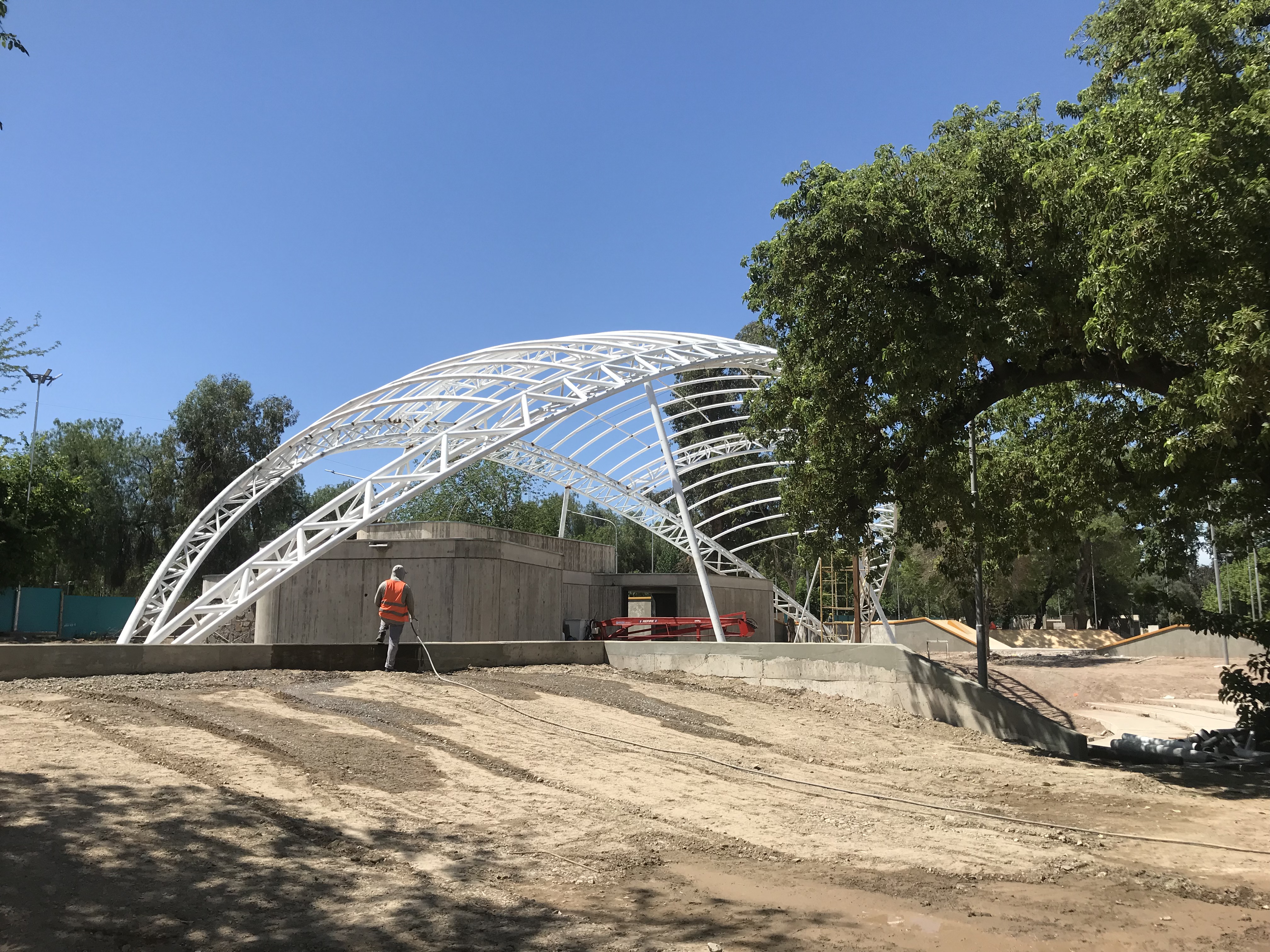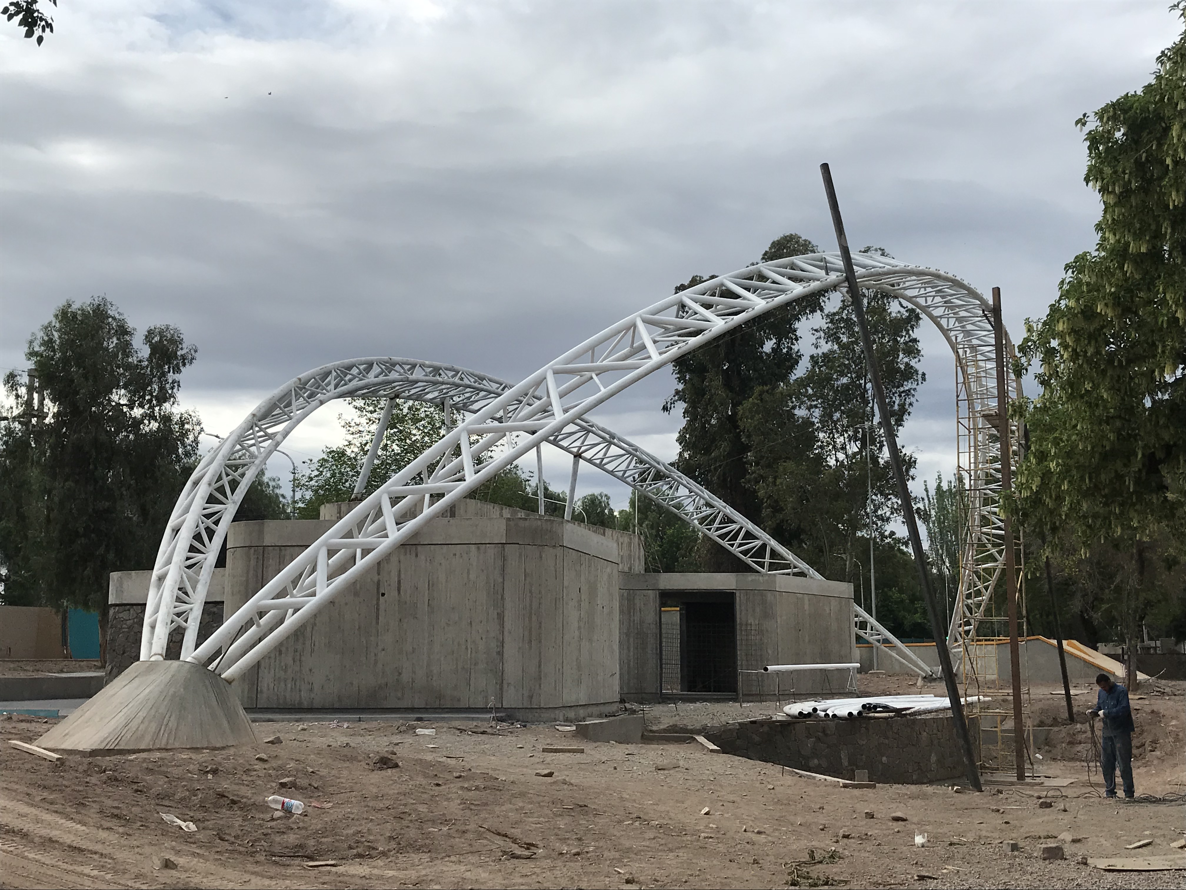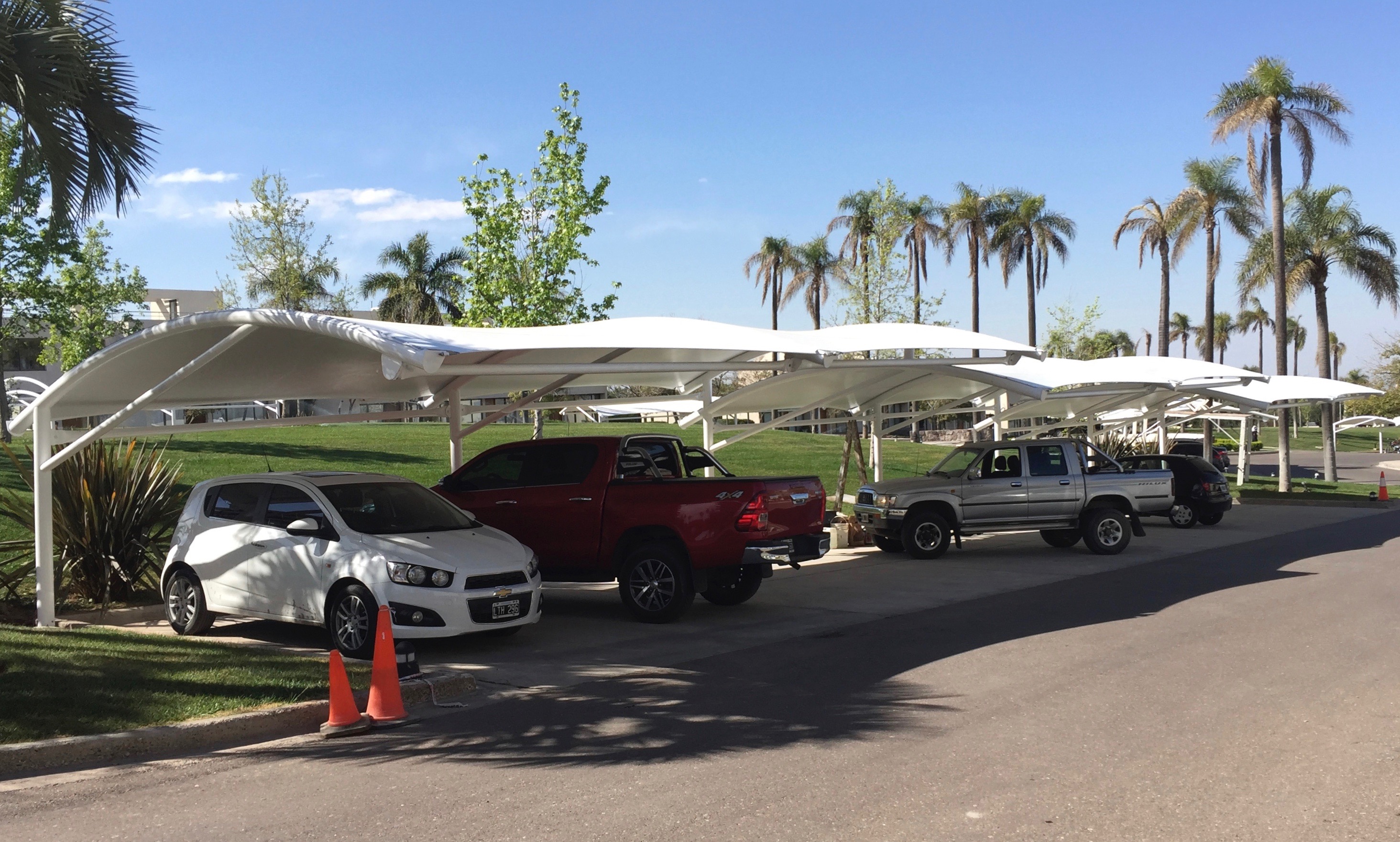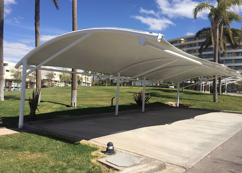 Membrana Textil Tensada tomada a Estructura Metálica compuesta por Pórticos de caño redondo.