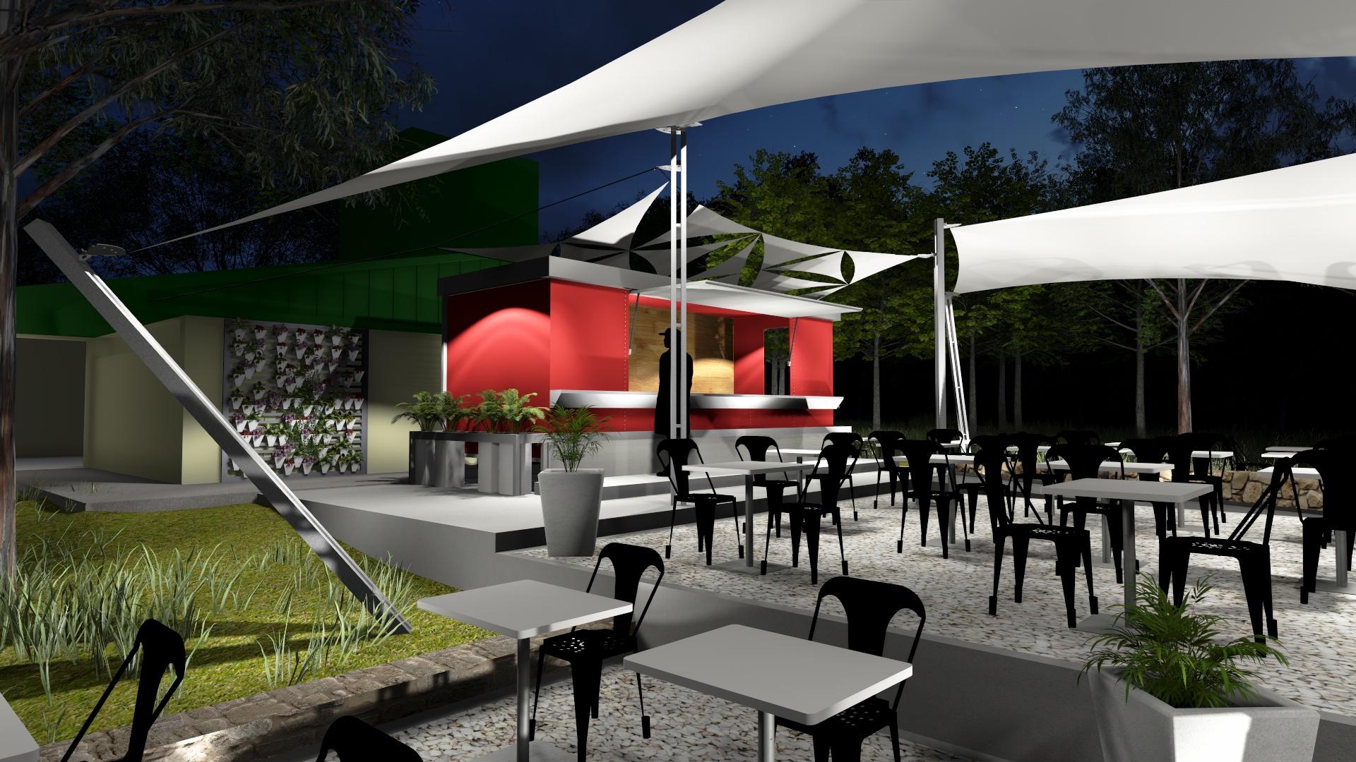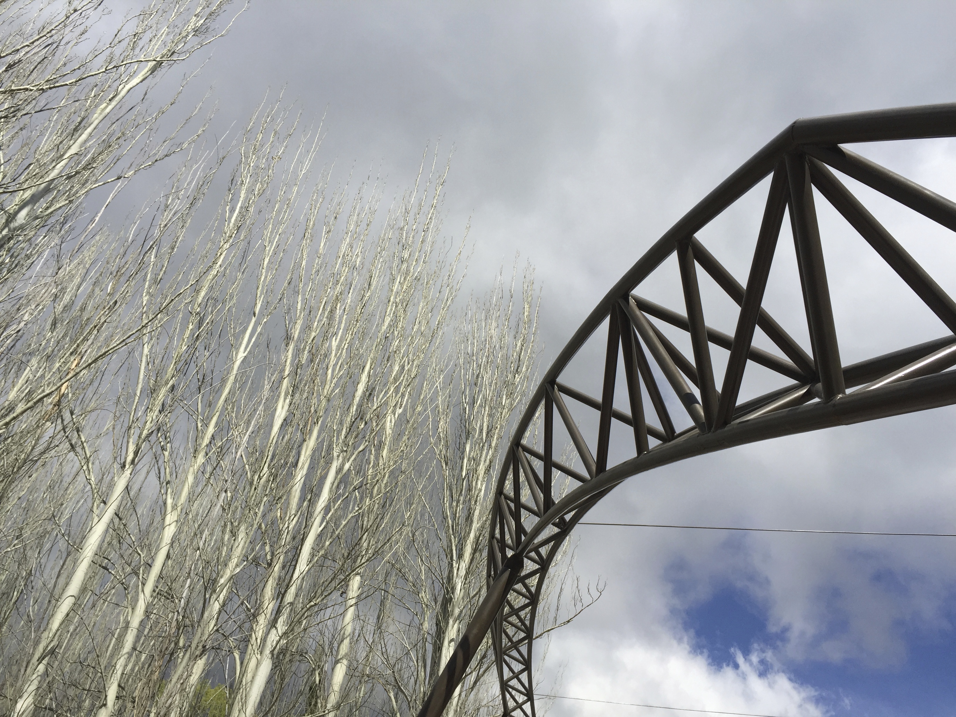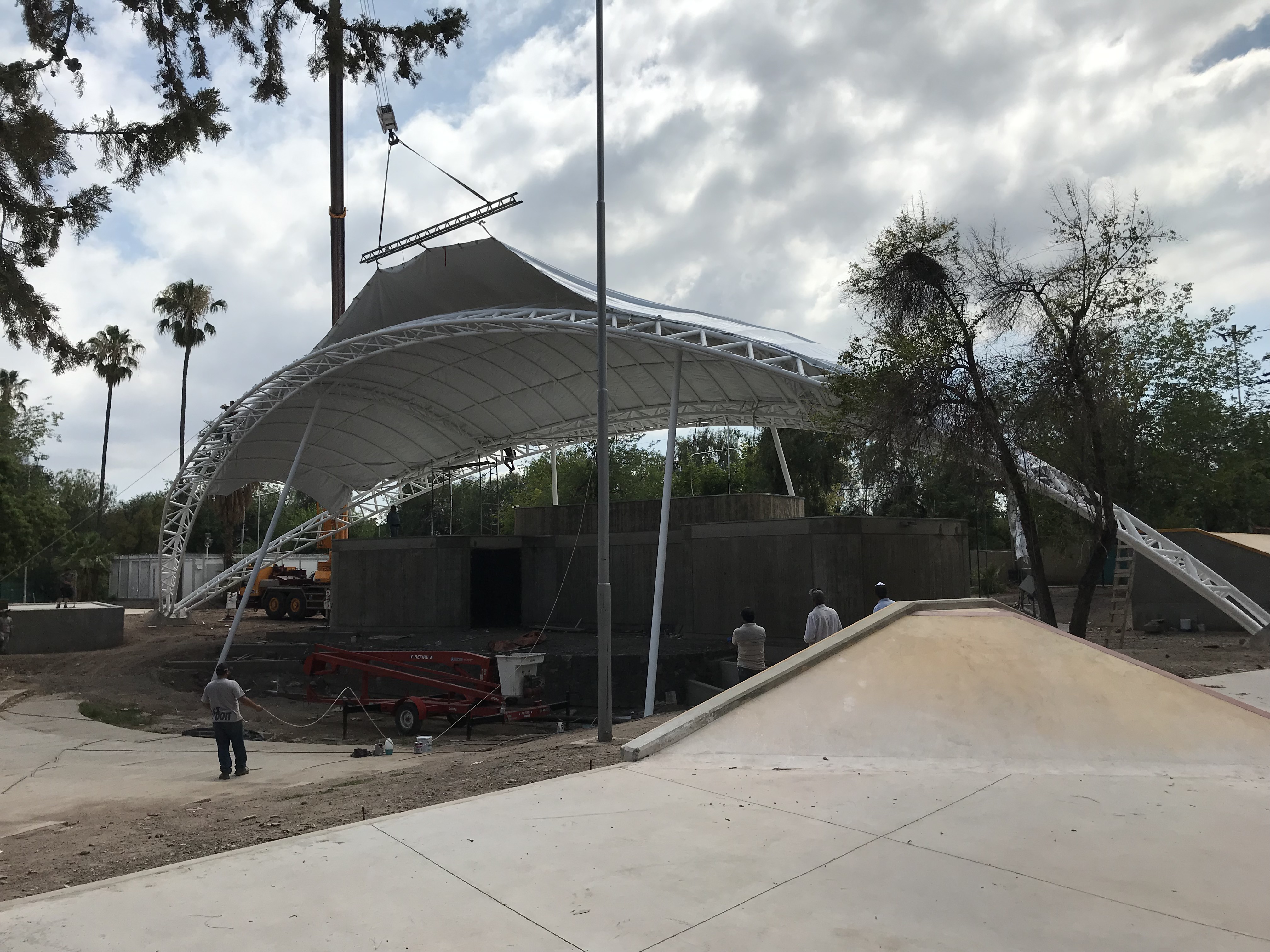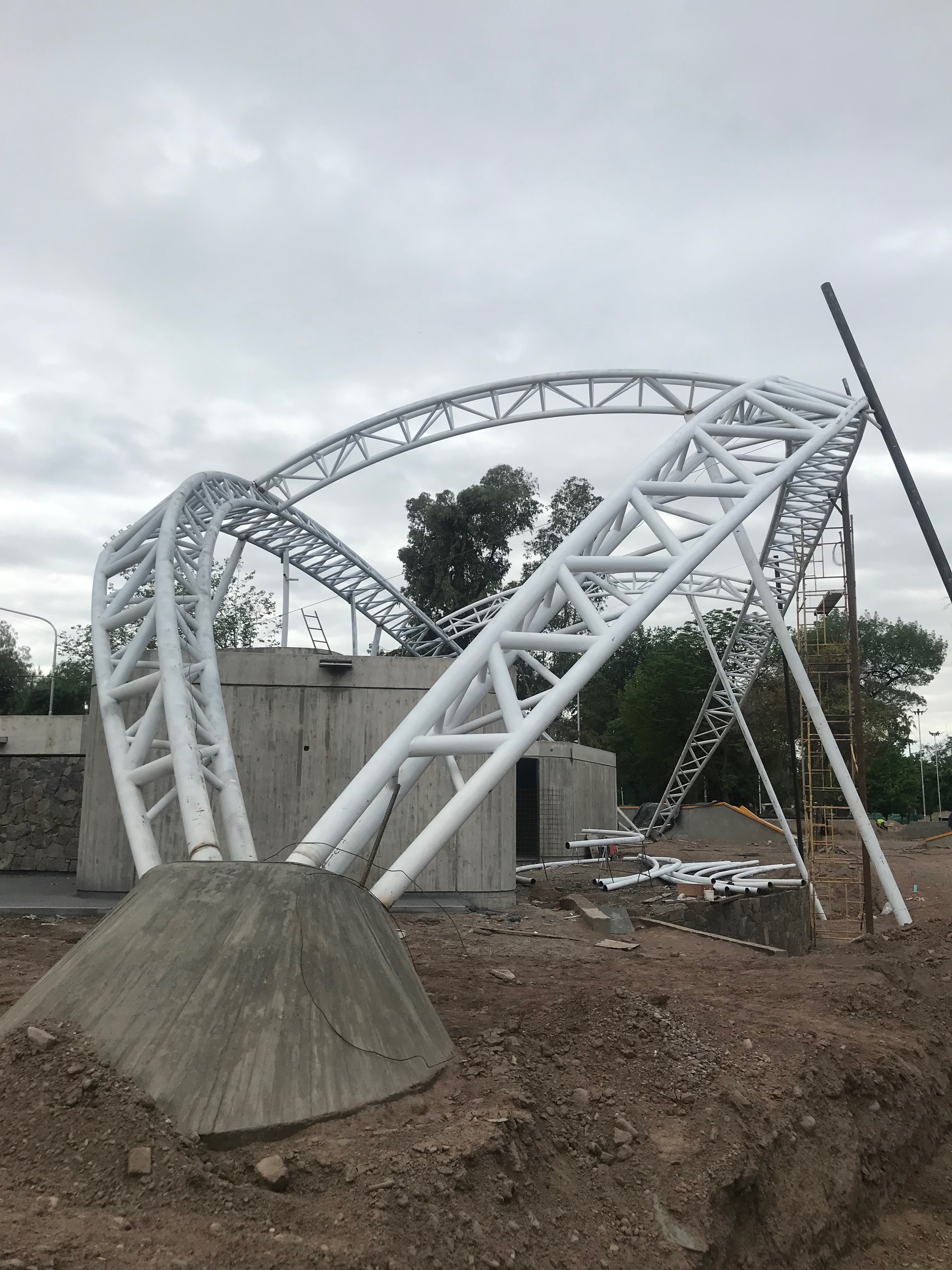 Membrana Textil Tensada tomada a Estructura Metálica compuesta por Pórticos de caño redondo.